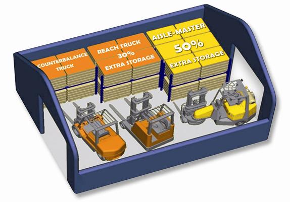 2. Минимизация проездов: За счет того, что погрузчик едет боком, проходы между стеллажами сужаются до ширины самой машины + минимальный зазор.
